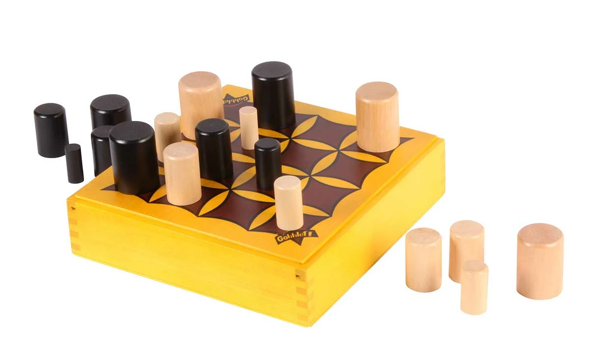 How to Play:Β The rules are simple. You and your opponent are both trying to get four light or dark pieces lined up in a row. The catch is that there are three different sizes of pieces, and you can steal your opponent’s spot by “gobbling” up their piece with a larger one of your own. This game builds strategy skills as you must carefully choose when and where to use your limited pieces to have the best chance of success!