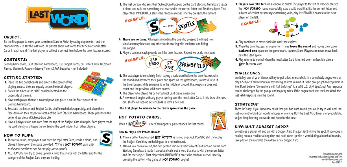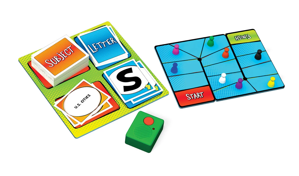 Last Word is a race to have the final say! Each round, blurt out answers while racing a timer and the other players. For example, Subject: “Snack Foods,” Letter: “P.” Players yell out, “Potato Chips!” Peanuts!” “Popcorn!” The player with the Last Word before the timer sounds advances toward the finish.