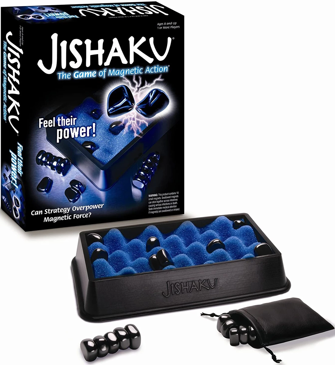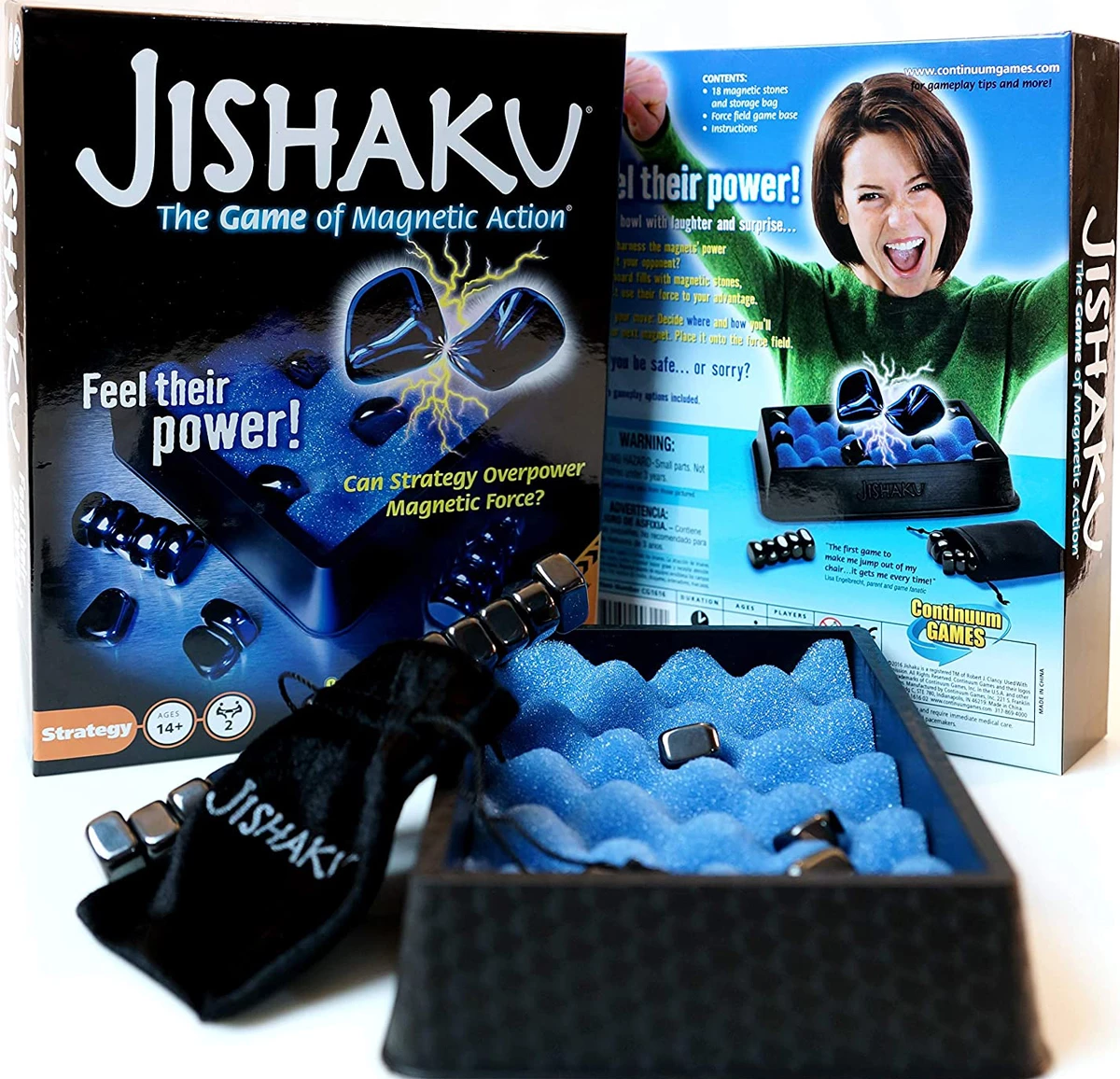 Jishaku is a portable strategy game that can be played anywhere โ the kitchen or the beach. There is an element of surprise when the magnets jump out of position, without warning. Surprise, then laughs, follow as two or more players try to beat force fields with strategic thinking plus careful and precise handling of the gameโs magnetic stones. The unpredictability of Jishaku turns any get-together into a party! Great Fun!