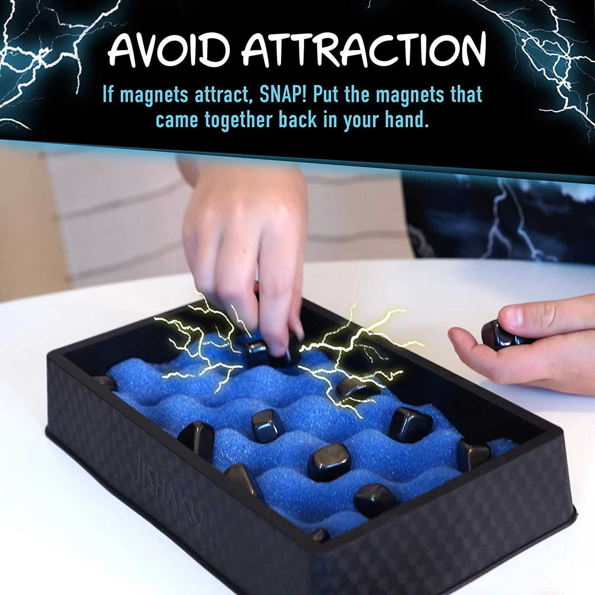 All magnets have north and south poles. Jishaku magnets do too. They just aren’t marked. So as you carefully place your magnet in a hole you can feel the tug of magnets all around the board. Skilled players learn to use magnetic force in their favor repelling the magnets closest to them without forcing them into other magnets. At least that’s the goal but the results can be quite surprising. The record for the most connecting magnets on a turn is twelve and in “i’m out” thatโs not a good thing. Find whether you can use magnetic force to outwit your opponent. ย Ages 14+.ย