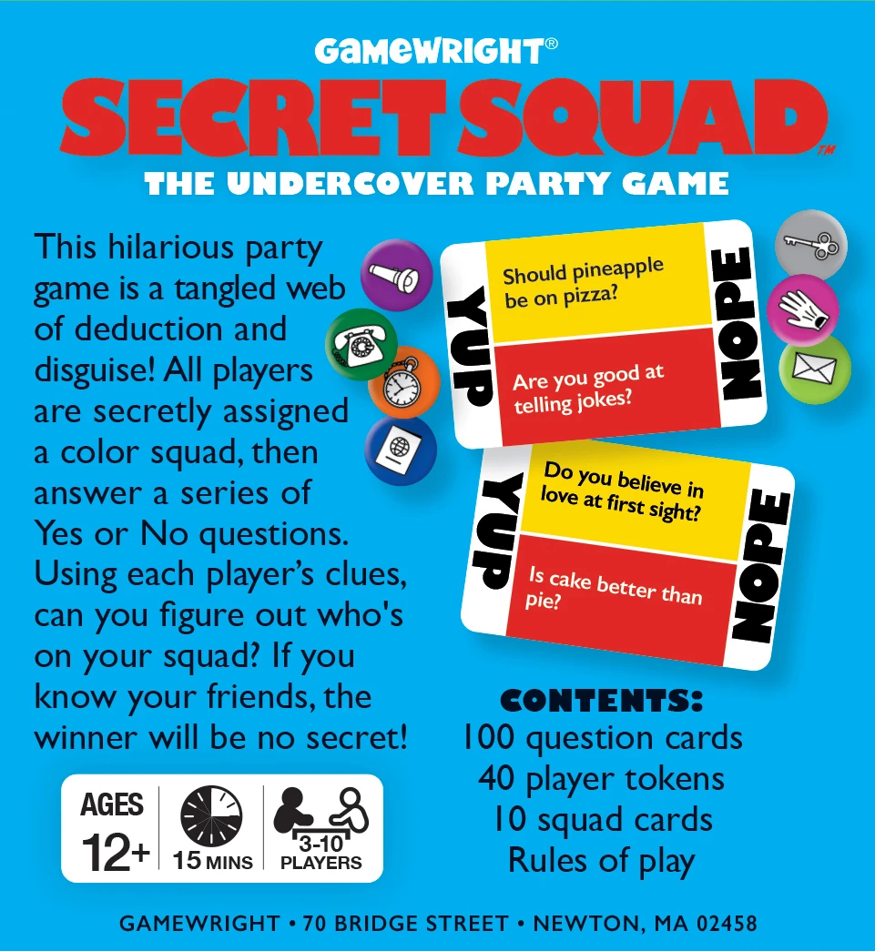 This hilarious party game is a tangled web of deduction and disguise! All players are secretly assigned a color squad, then answer a series of yes or no questions. Using each player’s clues, can you figure out who’s on your squad? If you know your friends, the winner will be no secret!