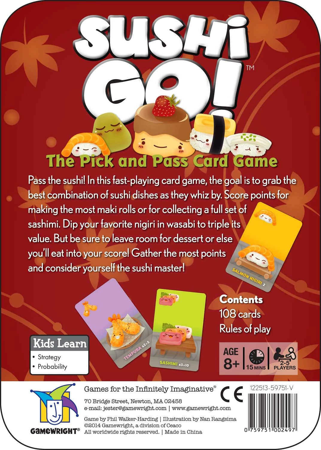 About this game: We’re huge fans of eating sushi here at Gamewright HQ, so it came as little surprise that we instantly fell in love with this “delicious” sushi-themed card game. Inventor Phil Walker-Harding created a unique and immediately approachable take on “card drafting” that makes for a game that’s easy to learn, quick to play, and yet engaging for all ages. Just like a great meal at a sushi bar, this game will have you coming back for more time and time again!