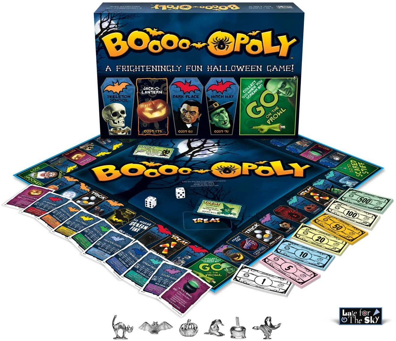 The Late for the Sky Boo-opoly Board Game is like the classic property game, but with a Halloween theme. Learn facts about Halloween while you play! The game includes Halloween-themed play pieces, paper money and a game board. This Late for the Sky Games twist on one of the most iconic board games around allows you to shake things up, and provides hours of entertainment.