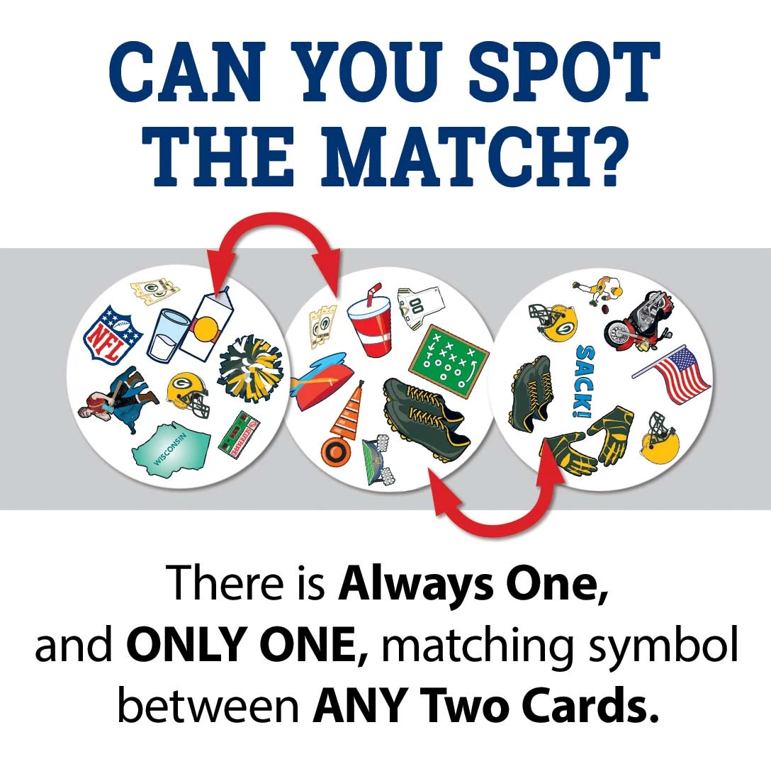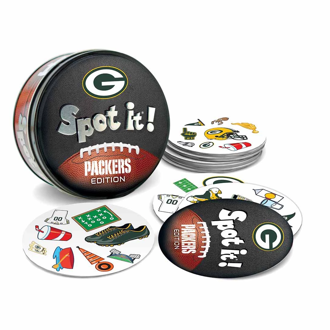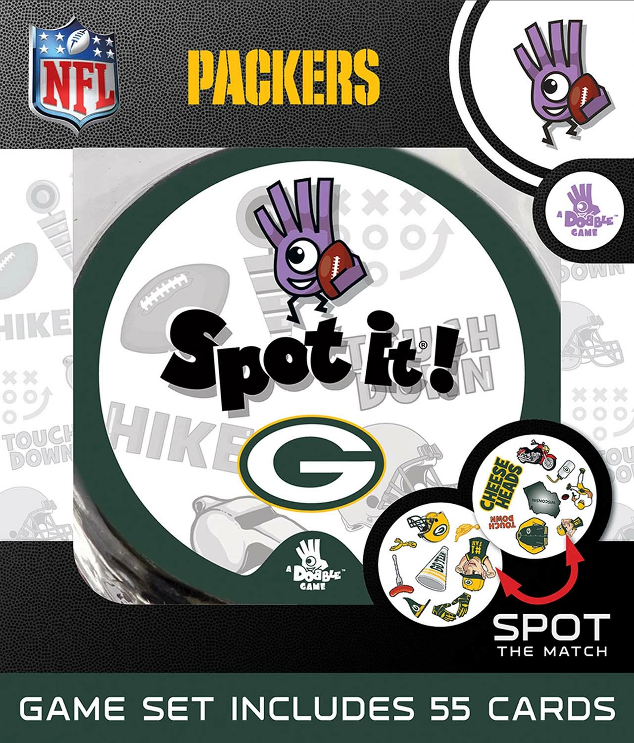 Spot It! Green Bay Packers Edition puts a football spin on the family favorite. Just like the other Spot It! games, this NFL Edition comes with a variety of unique symbols for you to identify and match from card to card. Many of the symbols represent Green Bay Packers and the game of football. Play it once or play all night, with 55 unique cards and five different mini-games.