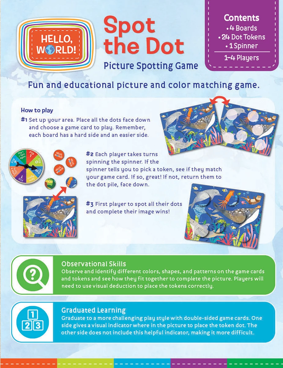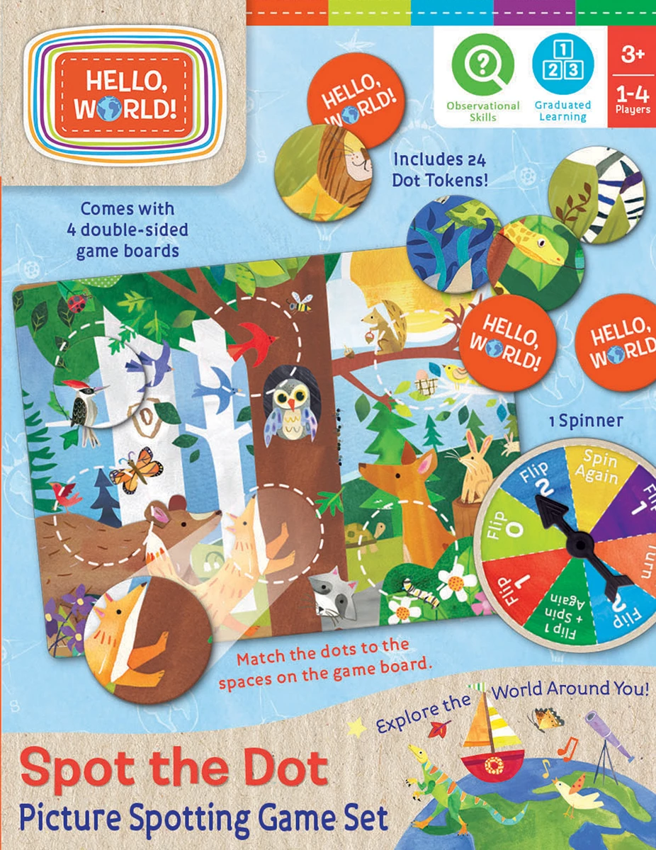 Spin the spinner, turn over picture dots, and match dots with your picture cards. Hello World Spot the Dot is a fun and colorful way to practice observational skills by matching colors, shapes and patterns to complete your picture before the other players. Graduate to the second side of the game card for an additional challenge of matching the dots to a picture without a hint where they belong. This Spot the Dot game is designed for kids 3 years and older and is fun for the whole family. It is a great game to learn and identify colors and patterns and see how they fit in and make up a complete picture. This game includes 4 game boards, 24 tokens, and a spinner.