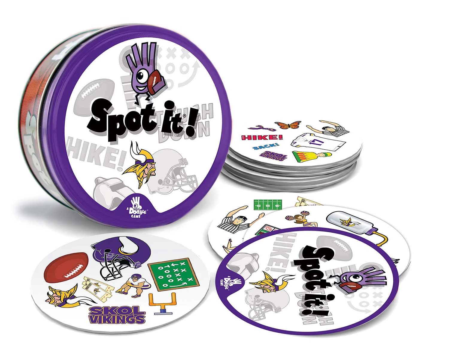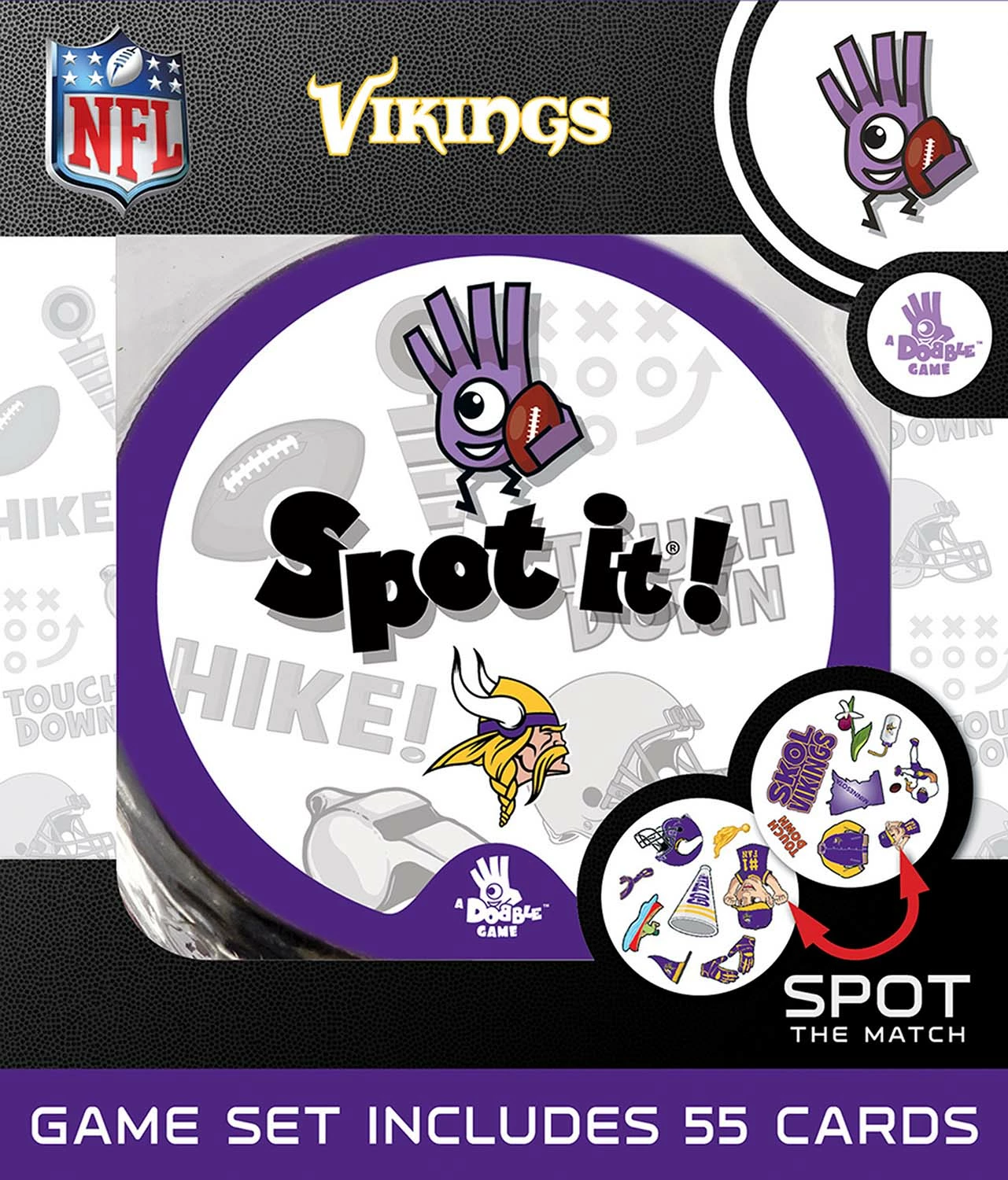 Just like the other Spot It! games, this NFL Edition comes with a variety of unique symbols for you to identify and match from card to card. Many of the symbols represent Minnesota Vikings and the game of football. Spot It! Minnesota Vikings Edition puts a football spin on the family favorite. Play it once or play all night, with 55 unique cards and five different mini-games.