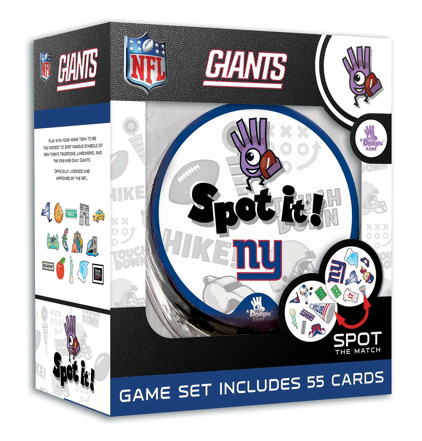 Spot It! New York Giants Edition puts a football spin on the family favorite. Just like the other Spot It! games, this NFL Edition comes with a variety of unique symbols for you to identify and match from card to card. Many of the symbols represent New York Giants and the game of football. Play it once or play all night, with 55 unique cards and five different mini-games.