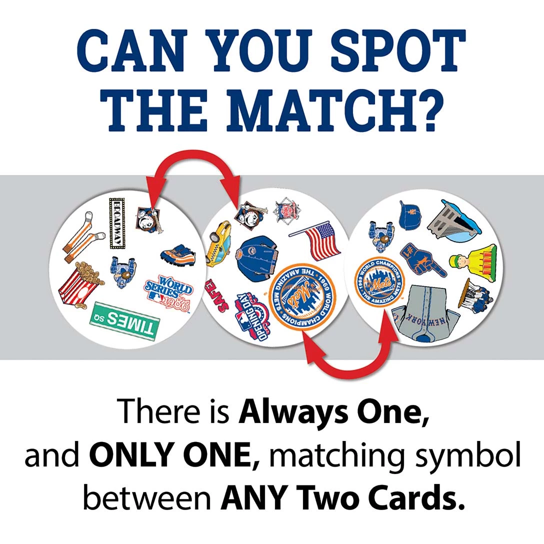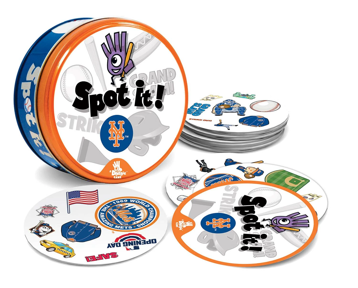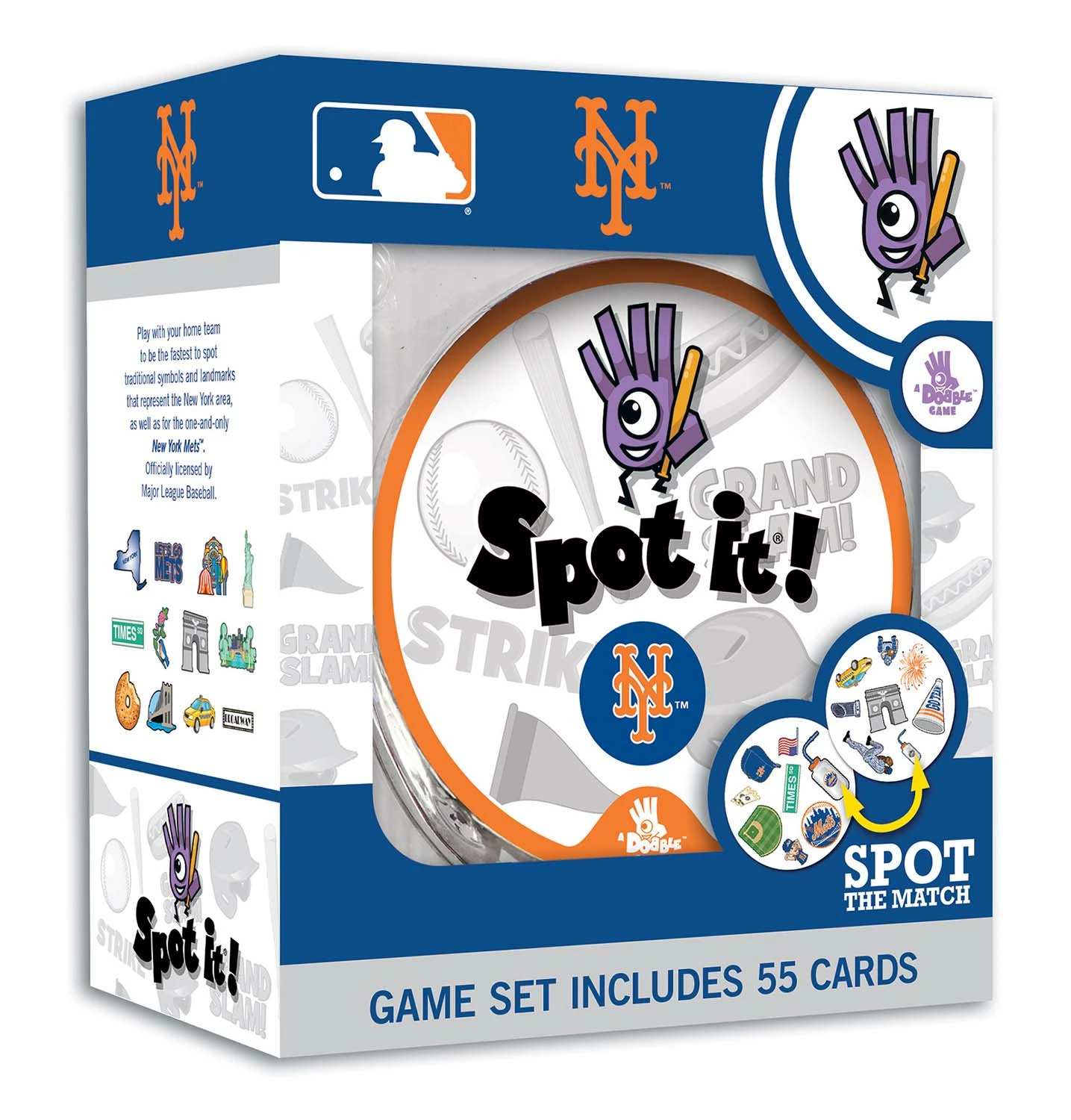 Spot It! New York Mets Edition puts a baseball spin on the family favorite. Just like the other Spot It! games, this MLB Edition comes with a variety of unique symbols for you to identify and match from card to card. Many of the symbols represent New York Mets and the game of baseball. Play it once or play all night, with 55 unique cards and five different mini-games, youโll catch yourself going into extra innings with Spot It! MLB Edition.