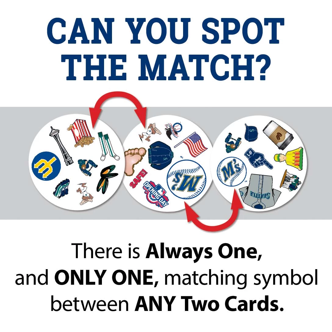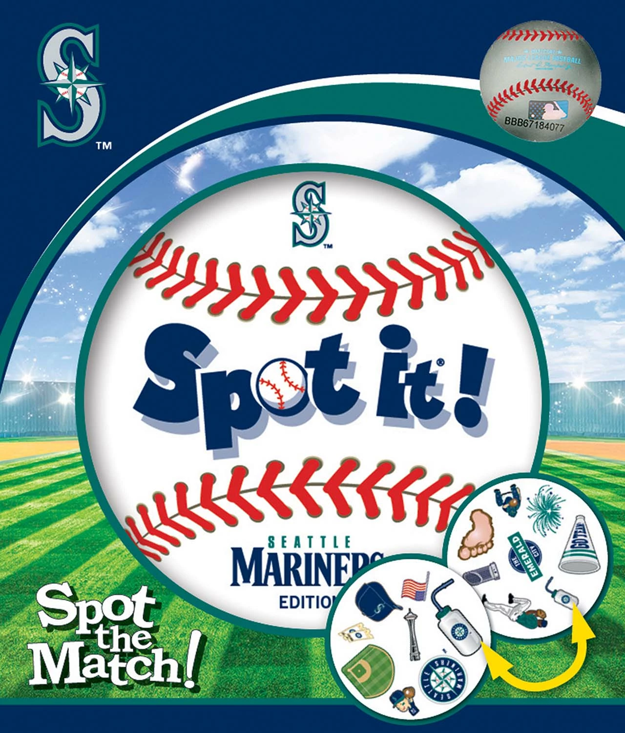 Spot It! Seattle Mariners Edition puts a baseball spin on the family favorite. Just like the other Spot It! games, this MLB Edition comes with a variety of unique symbols for you to identify and match from card to card. Many of the symbols represent Seattle Mariners and the game of baseball. Play it once or play all night, with 55 unique cards and five different mini-games, youโll catch yourself going into extra innings with Spot It! MLB Edition.