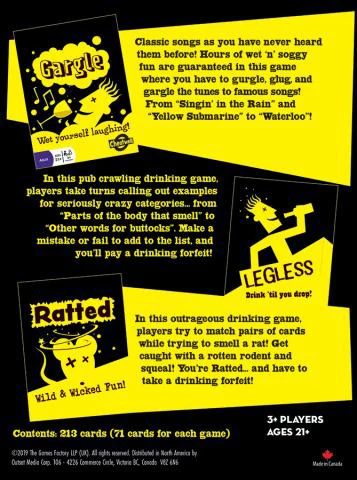 DRUNK-ISH is a crazy-hazy combination of three drinking games in one. GARGLE, LEGLESS, and RATTED will all have you laughing โtil you drop! Gargle the tunes to famous songs! Shout out crazy categories from โParts of a body that smellโ to โOther words for buttocksโ! Or match pairs of cards while trying to find the rat! Bond with your peeps and this boozy bunch of hilarity in a box!