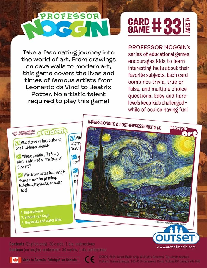 Professor Noggin card games are a fun way to learn about many of your favorite subjects. From nature to history to science, there is bound to be a card game to entertain any child. Kids can play Professor Noggin card games solo, simply as informational cards, or against other players. There are 30 cards in each box, with a total of 180 choices. Half the questions are categorized as easy and the other half is hard, this allows children of various ages or knowledge to play together. It’s a great card game to play during or after dinner and it’s easy enough to take to a friend’s house to play. Because each Professor Noggin card game has the same gameplay, it makes it easy for kids to add card games to their collection and start playing right away. ย Winner of over 15 awards!