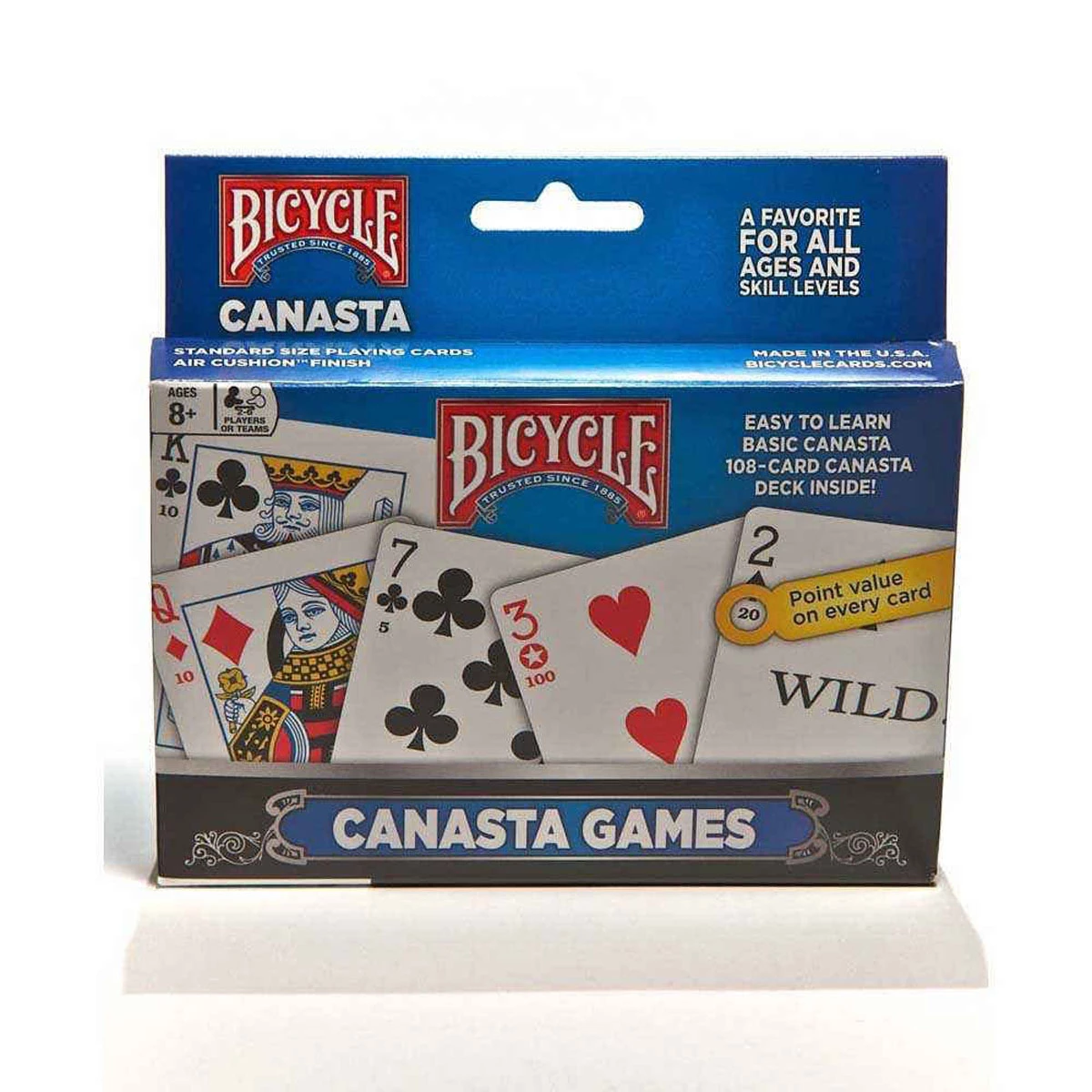 Canasta playing cards feature ‘value-added faces’ which displaying the point value on each card and highlights the WILD cards to make it easier to learn and more convenient to play.