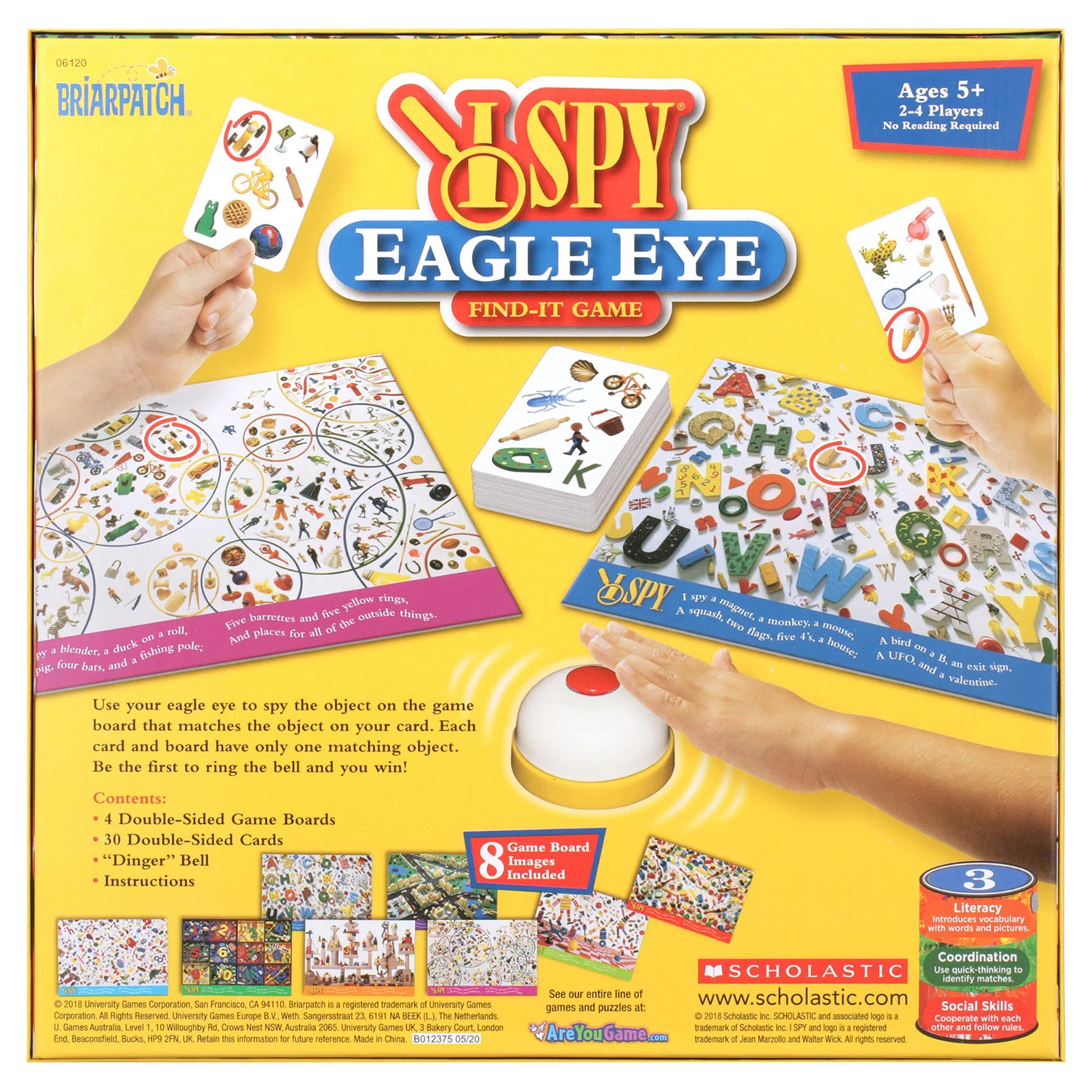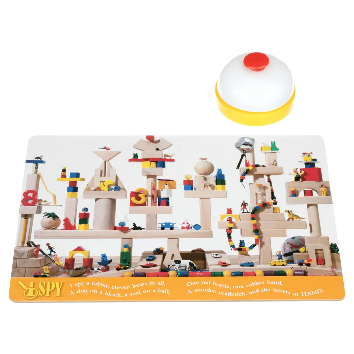 It’s a race to ring the bell! Can your eagle eye spot an item on your card that’s also on your game board? Look hard, there’s only one. Could it be the green race car, or the red ball? Once you find it, ring fast, and you win that round! Whoever spots the most objects wins the game. Fast, furious, and fun! I Spy Eagle Eye is based on the best-selling Scholastic book series by Jean Marzollo and Walter Wick.