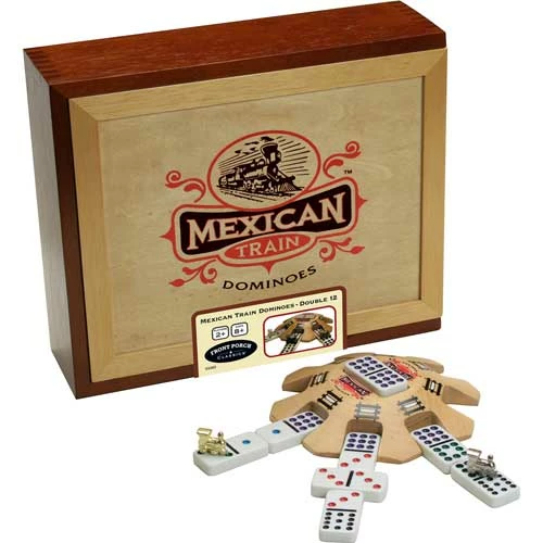 Mexican Train Dominoes, referred to by many as Trains, is a popular dominoes game where players work to dispense all the dominoes in their hand by playing them onto one or more chains (or trains) emanating from the central hub station. Front Porch Classics Mexican Train Dominoes feature the finest materials including an elegant wooden box.
